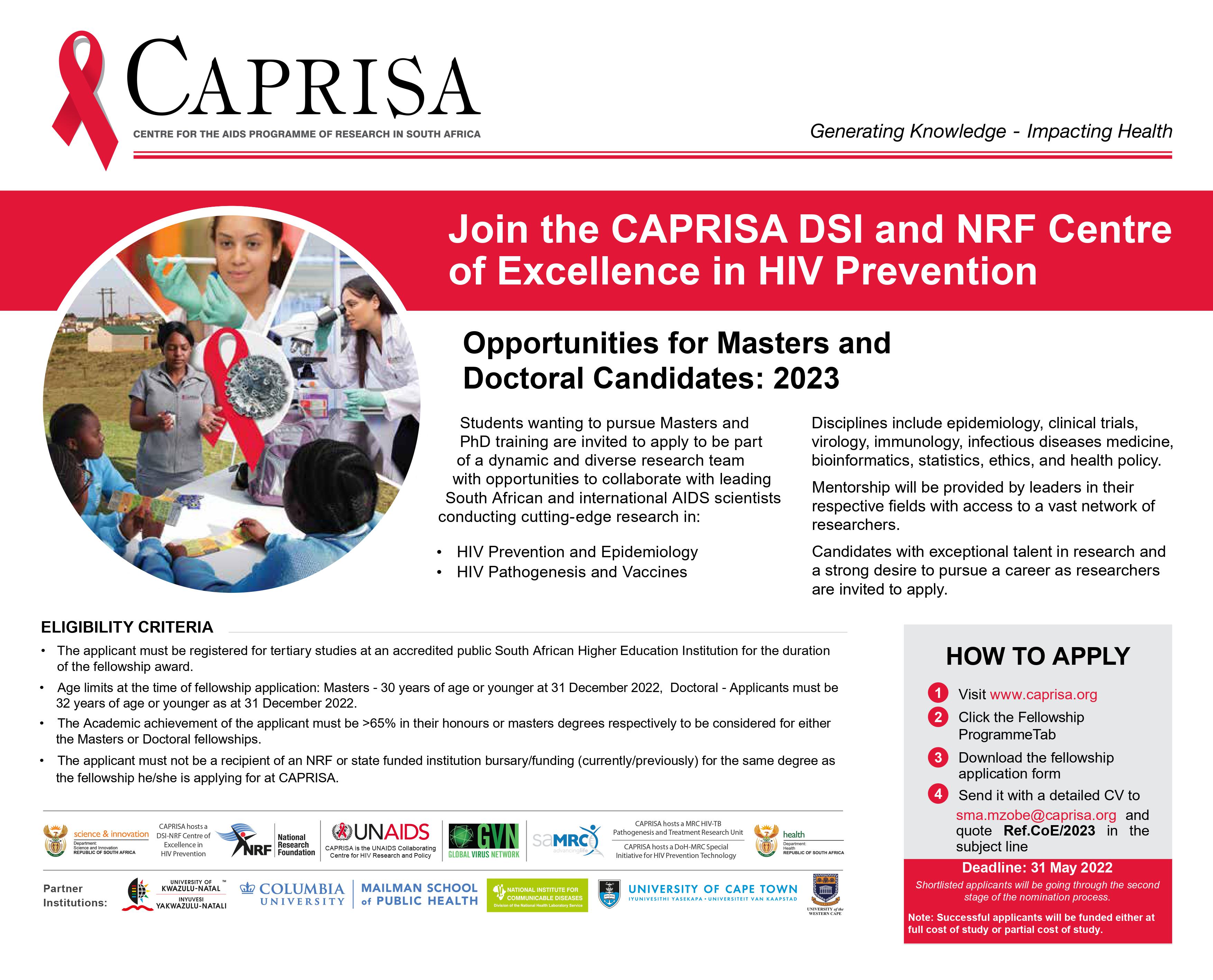 Join the CAPRISA DSI - NRF Centre of Excellence in HIV Prevention Masters and Doctoral Fellowship