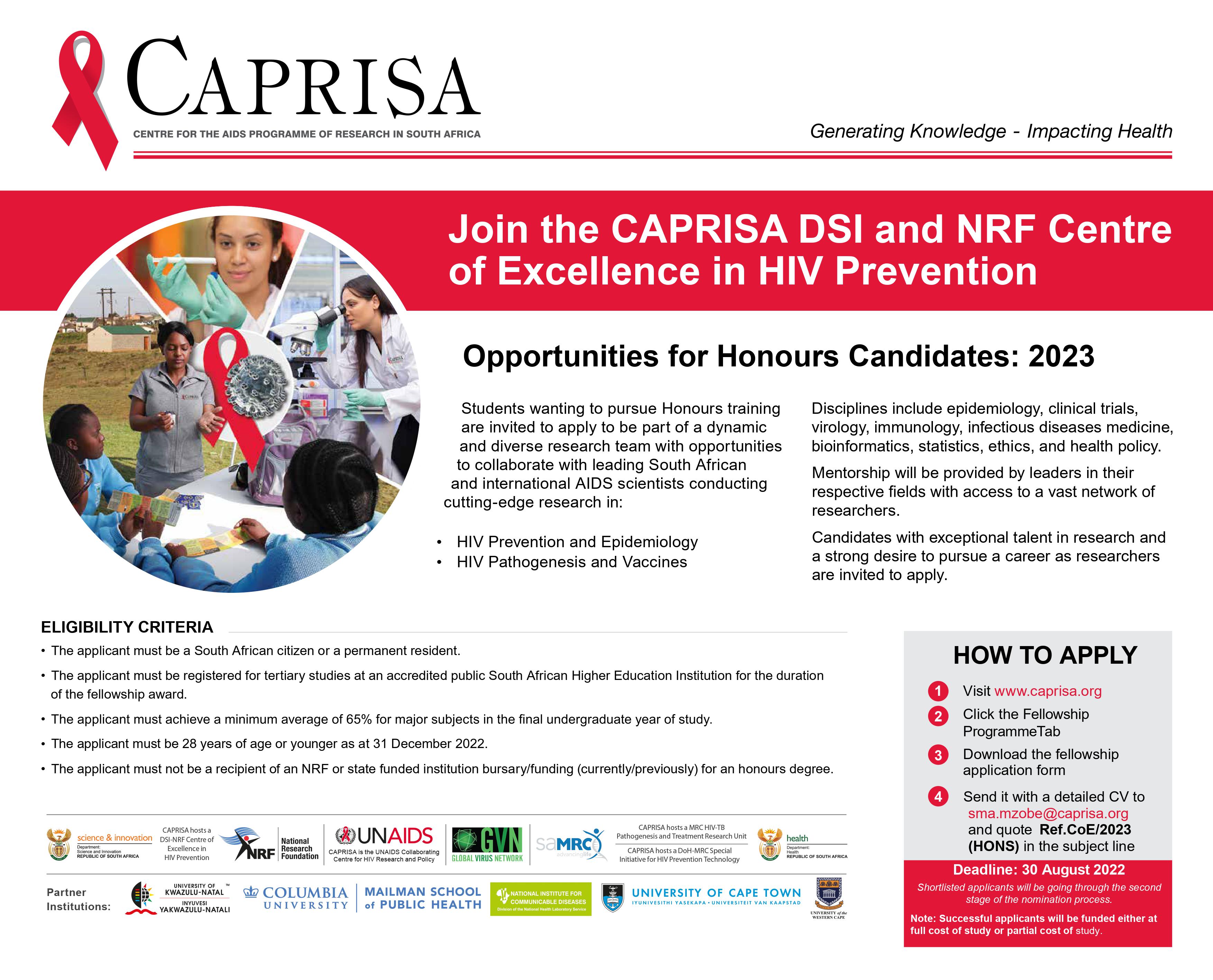 Download the fellowship application form and send it with a detailed CV to: sma.mzobe@caprisa.org and quote Ref.CoE/2023 (HONS) in the subject line.