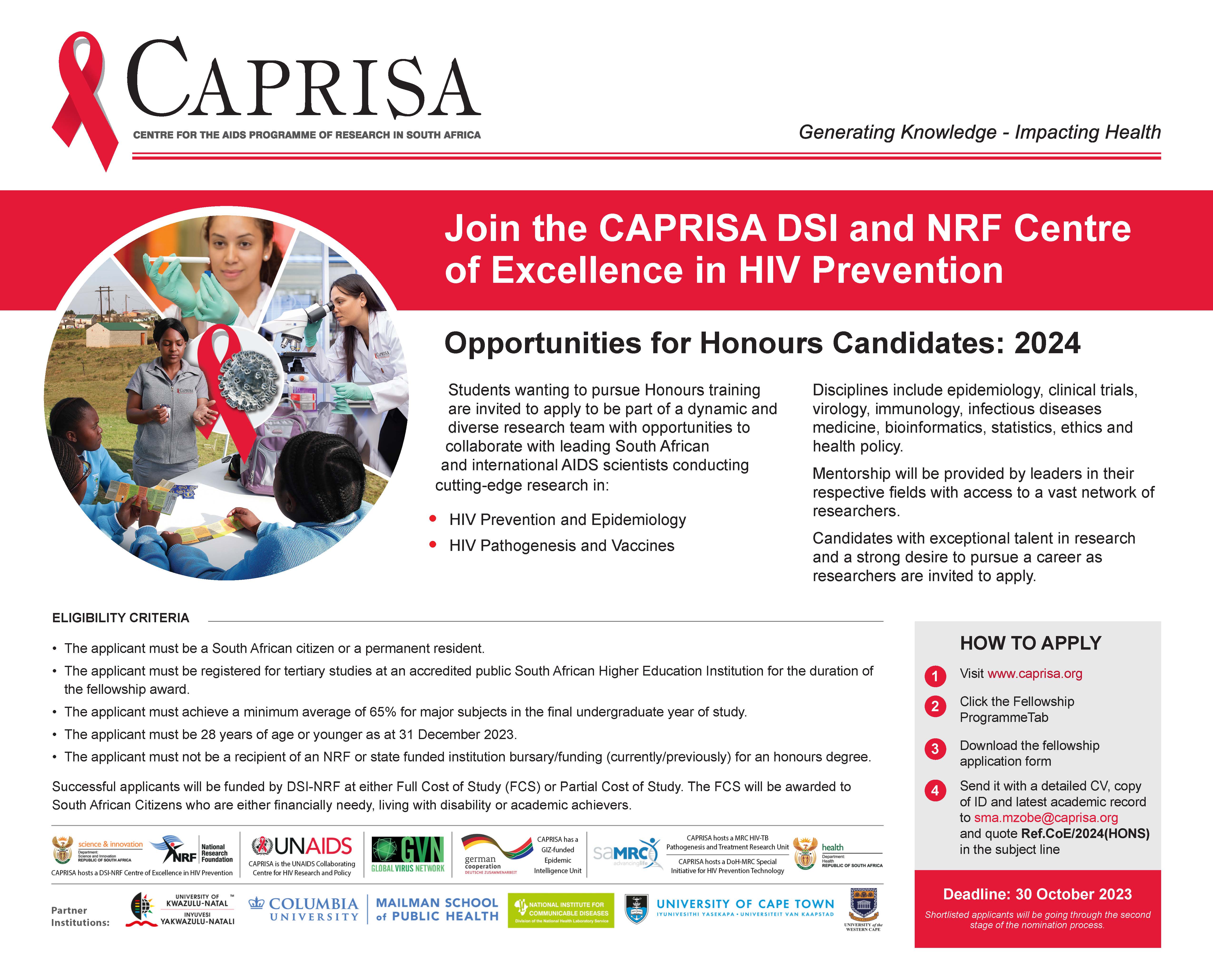 CAPRISA DSI - NRF Centre of Excellence in HIV Prevention Offers Honours Fellowship for 2024 in HIV Research